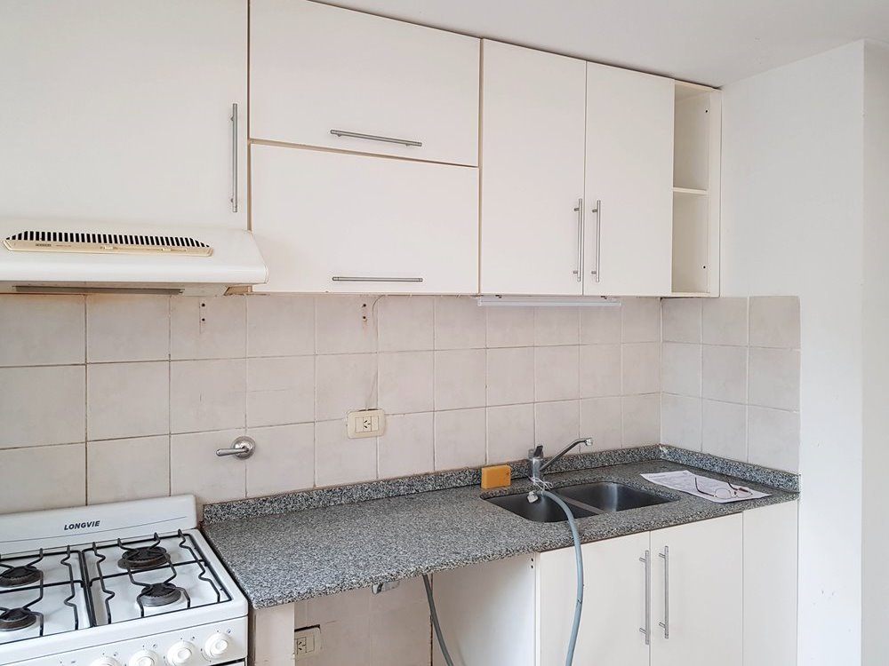 La unidad cuenta con living comedor al frente, con salida a balcón amplio con cerramiento de rejas, ideal como espacio adicional. La cocina se encuentra integrada al living, equipada con alacenas bajo y sobre mesada y una barra divisoria que aporta funcionalidad.